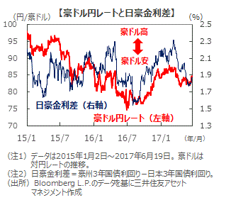 ■豪ドルの対円相場は、16年6月下旬を当面の底に戻り歩調を辿ってきたのち、資源価格の調整を受けて下落しましたが、足元では反発の気配を見せています。