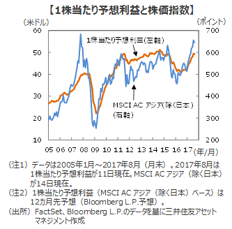 ■17年に入ってからのアジア株式市場の上昇は、企業業績の堅調さに裏打ちされています。17年の増益率は前年比+21.4%と予想されています(8月15日現在、FactSet 予想) 。18年は同+11.2% 、19年は同+10.2%と、3年連続で2桁の利益成長が続く見通しです。アジア株式市場は、利益成長の継続に対する期待を背景に、堅調さを取り戻すと考えられます。