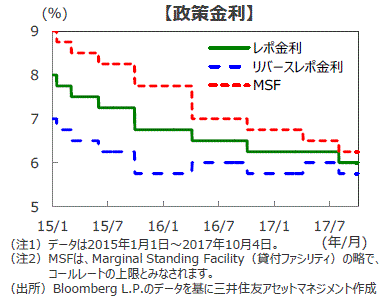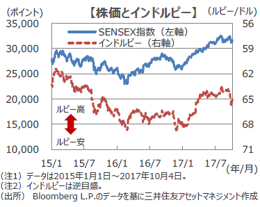 ■RBIは政策スタンスの中立を継続しており、金融政策は当面据え置かれると見られます。今後のインド株式市場は、景気の持ち直しに加えて、中長期的にはGST導入による経済の効率化から企業の利益成長の加速が期待されることなどから、堅調な推移が見込まれます。一方、RBIの物価見通しが上方修正されたことを一因として、4日のインド債券市場は下落しました。インフレの上昇はある程度抑制される見込みであるため、更なる金利上昇の余地は限られ、債券市場は落ち着きを取り戻すと思われます。インドルピーは、経済の高成長や改革期待を背景とした資金流入が期待されることから、対米ドルで底堅く推移すると見込まれます。