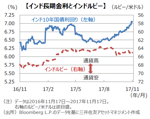 ■格上げが発表されたのは米国時間の16日で、翌日のインド金融市場はそれを好感した動きとなりました。株式のセンセックス指数は前日比0.7%上昇、通貨ルピーも上昇し、債券利回りは低下(債券価格は上昇)しました。