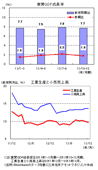 10-12月期の実質GDP成長率は、前年同期比+7.7%となりました。2013年通年の成長率も+7.7%となり、政府目標である+7.5%を達成しました。ただし、10-12月期の成長率を前期比で見ると+1.8%と鈍化しました。2013年半ばに景気回復を先取りした生産再開があったことの反動や、年末にかけて新規の投資計画が伸び悩んだことなどが影響したと見られます。