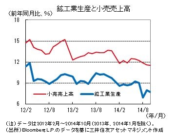 ■人民銀は声明で、「中小零細企業の資金調達コストが高止まりしている問題を解決することが、安定成長にとって重要」と指摘しました。7-9月期の実質GDP成長率は前年同期比+7.3%に減速したほか、鉱工業生産や小売売上高も減速傾向にあり、金利の引き下げで国内景気のテコ入れを狙ったものと見られます。