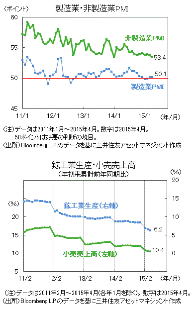 ■4月の製造業PMI(購買担当者景況感指数)は50.1と3月から横ばいでした。4月の生産は年初来累計ベースで前年同期比+6.2%の増加と、3月の同+6.4%の伸びを下回りました。