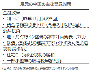 ■景気下押し圧力の高まりに対処し、政府・中央銀行は足元で景気対策を強化しています。利下げや預金準備率の引き下げにより企業の資金コストを軽減し、公共投資や規制緩和の拡大などの対策を講じています。