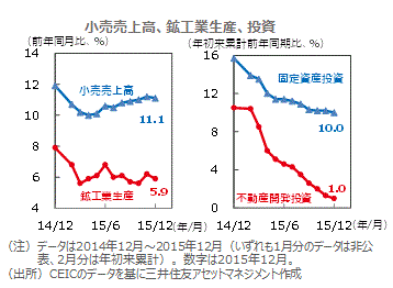 ■12月の鉱工業生産や小売売上高は、前年同月比の伸びが前月を下回り、景気は減速傾向を示しました。鉄鋼や石炭などの生産能力が過剰な業種の生産や投資の減少が影響しました。