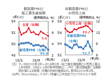 ■2月の製造業PMIは、1月から低下し、節目となる50を7カ月連続して下回りました。1-2月の鉱工業生産指数も前年比の伸びが縮小しました。過剰生産能力の削減や世界経済の減速を受けた輸出減少などが生産を抑制しました。