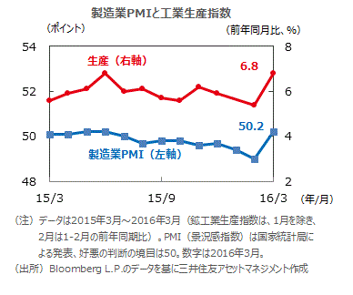 ■3月の工業生産高は前年同期比+6.8%と1-2月の同+5.4%から大きく改善しました。製造業購買担当者景気指数(PMI)も50.2と8カ月ぶりに景気判断の節目となる50台に乗せました。