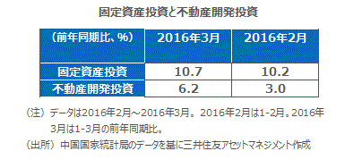 ■2016年1-3月の固定資産投資(設備投資や建設投資の合計)の増加率は前年同期比+10.7%と、1-2月の同+10.2%から拡大しました。不動産開発投資も1-3月は同+6.2%と、1-2月の同+3.0%から伸びが加速しています。