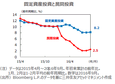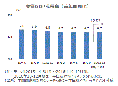 ■中国国家統計局が19日発表した16年7-9月期の国内総生産(GDP)は、物価変動を除く実質で前年同期比+6.7%でした。習近平指導部の16年の目標である「6.5~7.0%」の範囲内であり、市場予想(ブルームバーグ)と同じでした。7-9月期は長江の洪水被害の影響が懸念されましたが、公共投資が下支えしたと見られます。GDP成長率は3期連続で横ばいとなりました。10-12月期の成長率も横ばいが見込まれます。