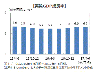 ■中国国家統計局は17日に主要経済指標を発表しました。2017年4-6月期の実質国内総生産(GDP)成長率は、前年同期比+6.9%と、市場予想(ブルームバーグ集計)の同+6.8%を上回りました。