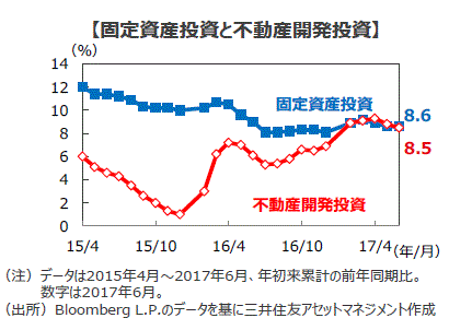 ■中国国家統計局が17日に発表した主要経済指標は、GDPや固定資産投資だけでなく、鉱工業生産や小売売上高も市場予想を上回るなど、総じて上振れました。中国当局は、不動産市況過熱に伴うバブル発生を警戒し、金融政策を引き締め気味に運営しています。政府の財政出動によるインフラ投資などから17年上半期の景気は上振れましたが、下半期は金融政策の引き締めなどの影響によりやや減速すると見られます。ただし、景気は比較的速いペースでの拡大が続く見通しです。