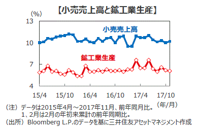 ■11月の固定資産投資や鉱工業生産の伸び率は引き続き前月を下回り、中国景気が緩やかに減速している姿が示されました。中国政府は10月1日から18年3月31日にかけて、地域限定で鉄鋼など一部の産業において環境保護のために生産抑制を行っています。この環境保護政策が当面景気を押し下げる方向に働くと考えられます。