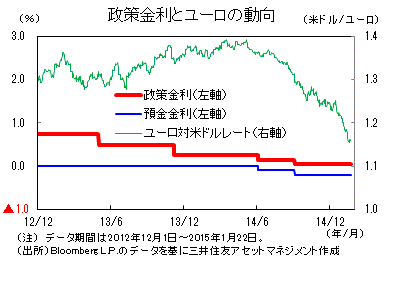 ■欧州中央銀行(ECB)は22日、月600億ユーロの国債、欧州機関債などの購入を、少なくとも2016年9月まで継続する量的金融緩和を決定しました。この期間の資産購入総額は1兆ユーロを超えます。また、政策金利、預金金利は、それぞれ0.05%、マイナス0.20%に据え置くことを決定しました。なお、ギリシャなどの重債務国の国債も条件付きで購入対象となりました。