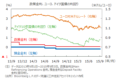 ■ドイツ国債の利回りは、金融緩和の強化も期待され、低位での推移が見込まれます。為替市場では、米国の年内利上げ観測から、ユーロは対米ドルで軟調に推移すると見込まれます。株式市場では、金融緩和強化への期待や、堅調な企業業績を背景として、底堅い展開が予想されます。