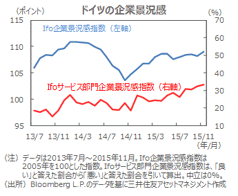 ■製造業などから構成されるドイツのIfo企業景況感指数の11月分は、前月から改善しました。サービス部門の企業景況感も改善傾向にあり、これが良好な雇用環境の背景です。これらの改善はこれまでのユーロ安や金融緩和の効果と考えられます。
