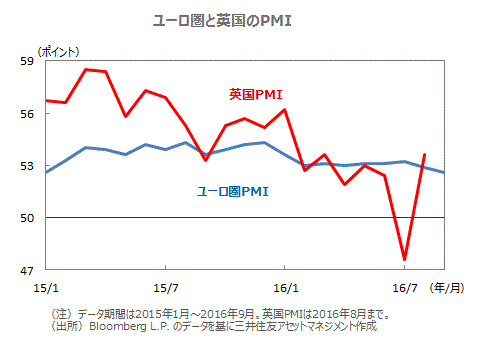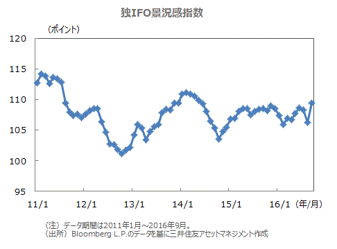■ユーロ圏では、英国のEU離脱(「Brexit」)選択による実体経済への悪影響が懸念されていますが、これまでの経済指標を見る限り、影響は限定的のようです。IFO期待指数やユーロ圏PMI(製造業)からすると、生産は年末にかけて持ち直すと見られます。また、消費者センチメントが安定していることを踏まえると、サービス業の経済活動も引き続き底堅く推移すると考えられます。このため10-12月のユーロ圏の成長率は7-9月からやや高まると見られます。