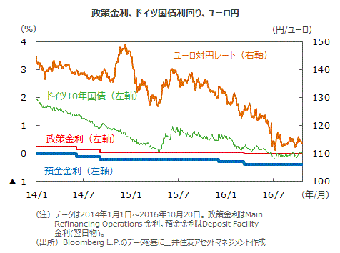 ■9月のユーロ圏の消費者物価は、前年同月比+0.4%と、ECBの目標である+2.0%近辺を大きく下回っています。ECBの経済予測(9月時点)では、17年と18年のインフレ率の見通しを+1.2%、+1.6%としていますが、景気が力強さを欠くなかで、物価は上がりにくい状況です。