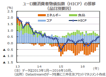 ■10月のユーロ圏消費者物価指数(速報値)は、前年比+0.5%と、前月の同+0.4%から若干加速しました。価格変動の大きいエネルギーの物価下押し圧力が薄まっており、インフレ率は当面緩やかに上昇すると見られます。