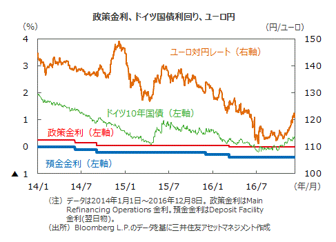 ■欧州中央銀行(ECB)は8日の理事会で、国債などを買って市場に資金を供給する量的緩和政策の実施期間を9カ月間延長し、17年12月末まで続けることを決定しました。ただし、17年4月から国債などの購入規模を現在の月800億ユーロから月600億ユーロに減額します。ECBが量的緩和の規模縮小に踏み切るのは初めてです。政策金利、中銀預金金利(金融機関がECBに余剰資金を預け入れた際に適用する金利)は、それぞれ0.00%、▲0.40%に据え置きました。