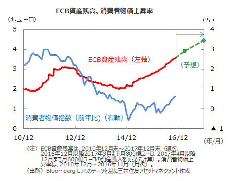■今回の金融政策については、市場の予想通り17年4月以降の資産購入の延長が決定されましたが、購入ペースは600億ユーロに減額されました。減額だけとればタカ派と見えますが、期間を勘案した購入額や記者会見の内容を含めて考慮すると、市場予想よりもハト派的な内容と考えられます。