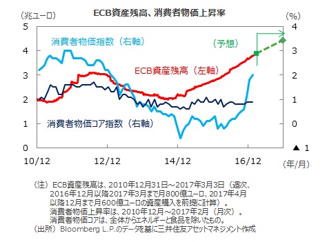 ■ECBスタッフによる経済見通しは、17年、18年の成長率が+1.8%、+1.7%と、前回12月に比べともに+0.1%上方修正されました。一方、消費者物価上昇率は17年が+1.7% 、18年が+1.6%でした。12月に比べ各々+0.4%、+0.1%の上方修正でしたが、最も注目された19年の予測値は+1.7%に据え置かれました。