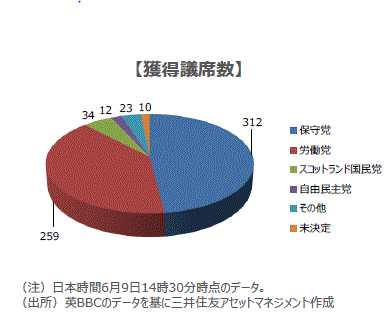 ■英BBCによれば、選挙の結果、どの党も単独では過半数に届かない「ハング・パーラメント」(宙づり議会)になる見込みです。このため、保守党による少数政権となるか、複数の政党による連立政権となるかが焦点となります。