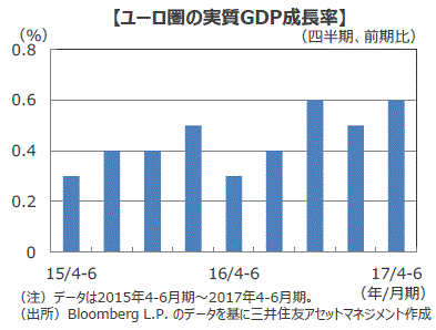 ■ユーロ相場は上昇基調にあります。背景には堅調なユーロ圏景気があります。2017年4-6月期のユーロ圏の実質GDP 成長率( 速報値) は前期比+0.6%となりました。成長率は市場予想(ブルームバーグ集計、以下同様)の通りで、2013年4-6月期以降、プラス成長を維持しています。