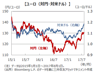■ユーロ圏景気は、今後も輸出や投資が堅調に推移すると見られ、7-9月期以降も順調な成長が続くと見込まれます。また、年前半に主要国で実施された重要選挙を波乱なくこなし、政治的にも安定が続きそうです。一方、米国では景気が堅調な中、トランプ政権は重要ポストの相次ぐ交代やオバマケア改革の審議難航など政治的な不透明感が増し、今後の経済成長にも影響を与えそうです。こうした相対的に良好な経済と政治の安定感がユーロの堅調な推移を支えそうです。