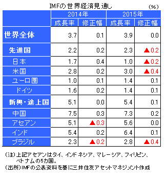 ・2014年の修正は、米国の財政協議合意の寄与や、日本の景気刺激策の反映などが主な要因です。