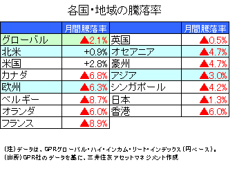 豪州は前月比▲4.7%(円ベース、うち豪ドル要因は▲5.4%)となりました。一部リートの買収が好感されたことなどにより上昇しました。