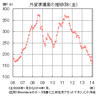 ちなみに、2013年12月の外貨準備高は188億ドルでしたが2014年1月には161億ドルまで大きく減少しています。また、外貨準備高のガス輸入金額比は1.6カ月分(13年12月)です。一般に、外貨準備高は輸入額の3カ月分が最低限必要といわれており、足元は大変厳しい状況に追い込まれています。