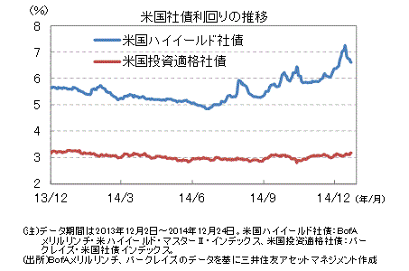 ■米国社債利回りを見ると、投資適格社債は安定した推移となりました。一方、ハイイールド社債は、年後半に過熱感が懸念され、需給環境も悪化する中、利回りが上昇しました。その後は好調な企業業績を背景に一時落ち着きましたが、年末にかけては原油価格の急落でリスクを回避する動きが強まり、利回りが再び上昇しました。