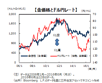 ■英国の国民投票後の金相場では、米国の長期金利や米ドルの動き、すなわち米国の金融政策や地政学的リスクなど、今後の金融市場に影響を及ぼす事象に焦点があたると思われます。不透明感が強まれば、金価格が堅調に推移する可能性が高まると考えられます。金価格の動向は、金融市場に対する投資家の心理状態を推し量る参考になります。いわば、「市場心理のバロメーター」と考えられ、金価格の動向が注目されます。