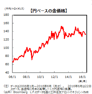 ■金価格は11、12年のピークの後、下落基調で推移してきましたが、今年に入り上昇に転じています。6月22日の価格は、年初来で19.3%の上昇となっています。その要因は、米国利上げ期待の後退を受けて、ドル安が進行したことと、年初に発生した金融市場の不安定さから、金の安全資産としての見直し機運が高まったためと思われます。