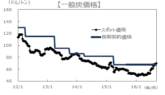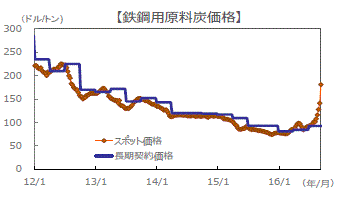 ■石炭価格の上昇基調が続いています。発電用燃料などに使われる石炭のスポット価格は、4月初めの安値から4割程度の上昇となっています。また鉄鋼用の原料炭(コークス用途)価格は、足元急騰し、昨年末の安値から2倍以上となっています。