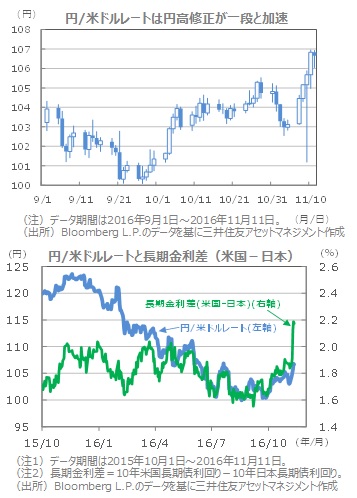 ■今回円高修正の動きが加速した背景には、トランプ次期大統領の景気政策の柱が財政拡大であることから米国長期金利が上昇し、日米長期金利差が拡大したことがあげられます。