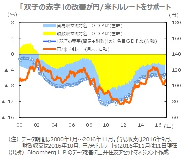■財政赤字が巨額となれば、これまで改善が進んでいた双子の赤字(貿易赤字と財政赤字)が悪化する可能性があり、米ドル安・円高に結び付きかねません。次期政権は歳出抑制から歳出拡大へと大きく方向転換する見通しですが、議会との協議により現実的な規模となれば、過度に円高を懸念する必要はないと思われます。