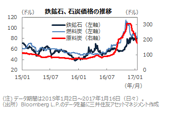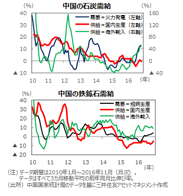 ■価格上昇の背景には、最大の消費国である中国の景気持ち直しに対する期待と、生産能力削減を主因とする需給関係の好転があると見られます。特に石炭は、中国政府による鉱山の生産能力削減や減産指導が在庫削減に寄与しました。