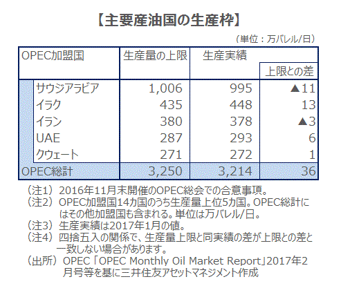■石油輸出国機構月報(OPEC Monthly OilMarket Report)の最新号によれば、2017年1月のOPEC総生産量は日量3,214万バレルとなりました。16年11月末のOPEC総会で合意した原油生産量の上限である同3,250万バレルを同36万バレルほど下回る水準です。国際エネルギー機関(IEA) は、OPECの当初の減産は目標の90%に達したと述べています。