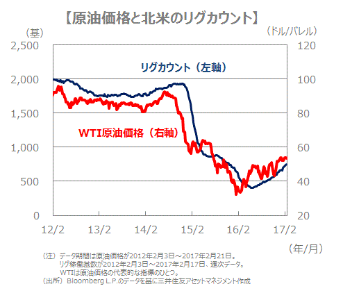 ■需給動向から判断すると、協調減産が維持される限り、原油価格が大きく崩れる公算は小さいと考えられます。一方、価格がバレル当たり55ドル~60ドルを超えると、シェールオイル増産の可能性があり、上値の余地も限定的と考えられます。当面のところ、原油価格は同50ドル近傍での推移となりそうです。