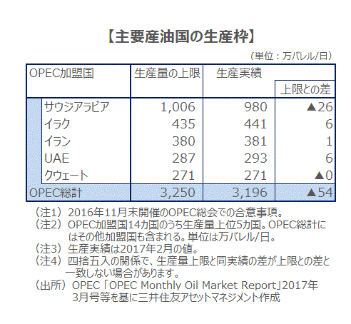 ■16年11月末のOPEC総会で合意した原油生産量の上限である同3,250万バレルとの比較では、同54万バレル低い水準です。これまでのところ協調