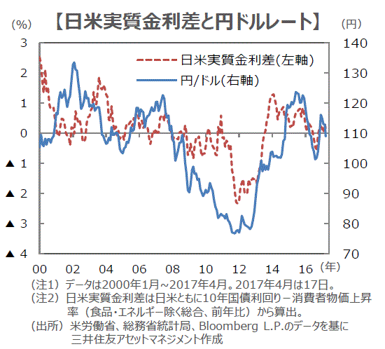 ■4月11日に約5カ月ぶりに1ドル=110円を割り込んだドル円相場は、17日に108円台前半までドル安円高が進みました。今回の円高は、インフレ率の下振れというマクロ面の変化に、北朝鮮問題等の地政学リスクが強く意識された結果と思われます。