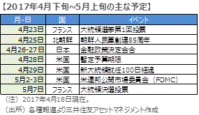■北朝鮮を巡っては、米国と中国が経済制裁などによって事態の沈静化を進めると見られます。フランス大統領選挙ではメランション氏の支持率が伸びておらず、これ以上の複雑化は回避されそうです。政治情勢が安定化すれば、為替の変動は次第に経済要因へと回帰する傾向が強まると思われます。