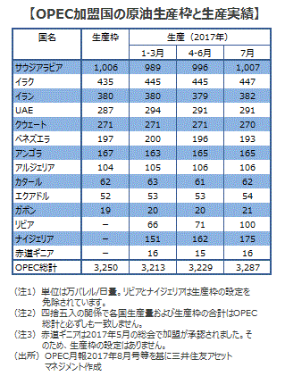 ■7月の生産量は、16年11月のOPEC総会で合意に達した生産枠の上限を超えています。内戦の影響等を考慮され、減産を免除されているリビア、ナイ