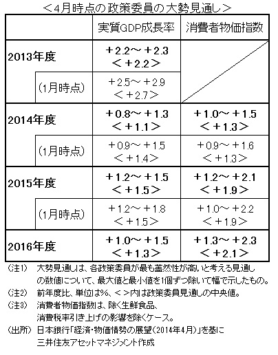 異次元緩和からおよそ1年が経過し、日銀が目標とするマネタリーベースは順調に増加し、消費者物価指数も上昇してきています。3月の全国の消費者物価指数(生鮮食品を除く、以下コアCPI)は前年同月比+1.3%となり、消費税増税後の状況が反映される4月の東京都区部のコアCPIは消費税増税がほぼ転嫁されたため、同+2.7%と大幅に上昇しました。このように、現状は日銀が想定している形で推移していると見られます。しかし、消費税増税後の個人消費や鉱工業生産などの指標が着実に回復していくと見るには、まだ各種の経済指標が揃っておらず不透明な要素もあると見られます。特に物価上昇率については、日銀は需給バランスの改善や企業、個人において物価上昇の意識が高まりつつあるとして、目標の2%に向けて上昇していくとしていますが、市場では達成が厳しいという見方もあります。
