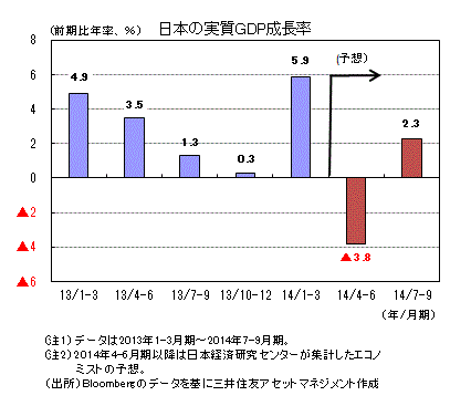 2014年度のGDP成長率は、4-6月期は駆け込み需要の反動減でマイナス成長が見込まれますが、7-9月期以降は徐々に持ち直しプラス成長に転じると思われます。日本経済研究センターが発表している民間エコノミスト42名の予想集計値の実質GDP成長率は4-6月期が前期比年率▲3.8%、7-9月期は同+2.3%となっています。