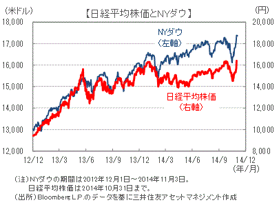 ■日銀が10月31日に予想外の追加金融緩和を発表した後、日本をはじめとして世界的に株価が急騰しました。日経平均株価の同日の上昇幅(前日比+755.56円)は、リーマン・ショックによる急落後の反発局面(2008年10月)以来の大きさです。NYダウは同日、史上最高値を更新しました。