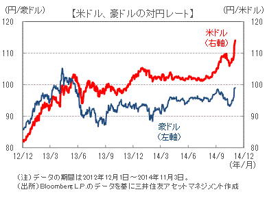 ■また、為替市場では円安が進みました。米ドル円レートは2007年12月以来約7年ぶりとなる1米ドル114円台となりました。米国では、29日に量的金融緩和(QE)の終了が決まったばかりであり、日米の金融政策の方向性の違いが改めて材料視された形です。