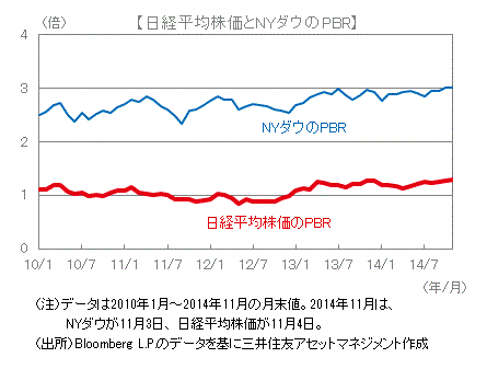 ■日経平均株価は、直近の安値となる10月17日の14,532.51円から約2週間で約+16%上昇するなど短期的にはやや過熱感があります。ただし日経平均株価の株価純資産倍率(PBR)は1.3倍と「NYダウ」の3.0倍を大きく下回り、割高感が薄いと見られる指標もあります。