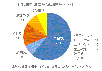 ■14日に投開票された衆議院総選挙では自民党が単独過半数となる291議席を確保し、連立を組む公明党と合わせて3分の2以上となる326議席を維持しました。民主党や共産党は議席を伸ばしましたが、野党全体としては伸び悩みました。争点とされたアベノミクスは一応の信任を得た形です。